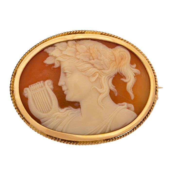 Die ovale Fassung ist mit einem zarten geflochtenen Muster versehen. Darin thront eine wundervolle Gemme (Muschelcamée).