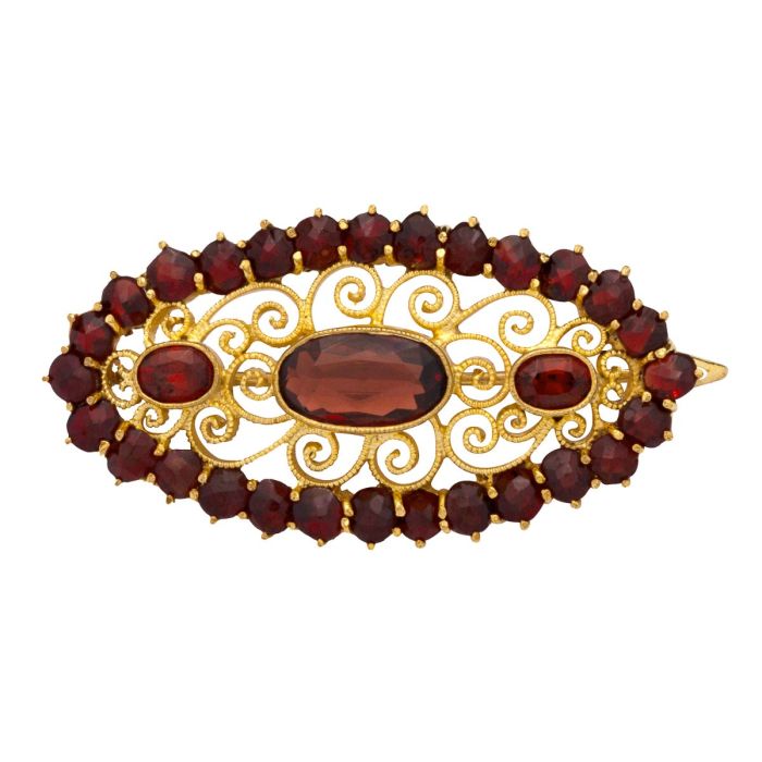 Mittig sind ebenfalls Granatsteine in ovaler Form in Zargenfassung gesetzt.