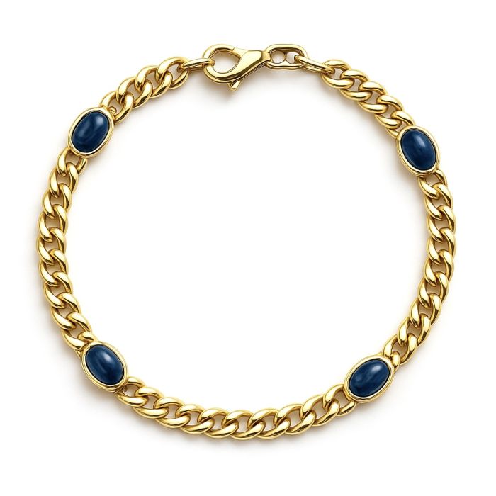 Das Schmuckstück hat eine klassische Panzergliederung, welche durch ovale Zwischenglieder aufgelockert wird. Diese fassen je einen dunkeln Saphir in Cabochonschliff.