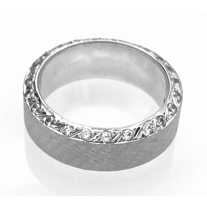 Massiver Damenring in 585er Weißgold. Der Ring hat eine Ringschiene von 6,91 mm Breite. Sie hat eine rauteförmige Strunktur ringsherum. Die Seiten sind leicht abgeschrägt. Daring funkeln, ebenso ringsherum, Zirkonia.
