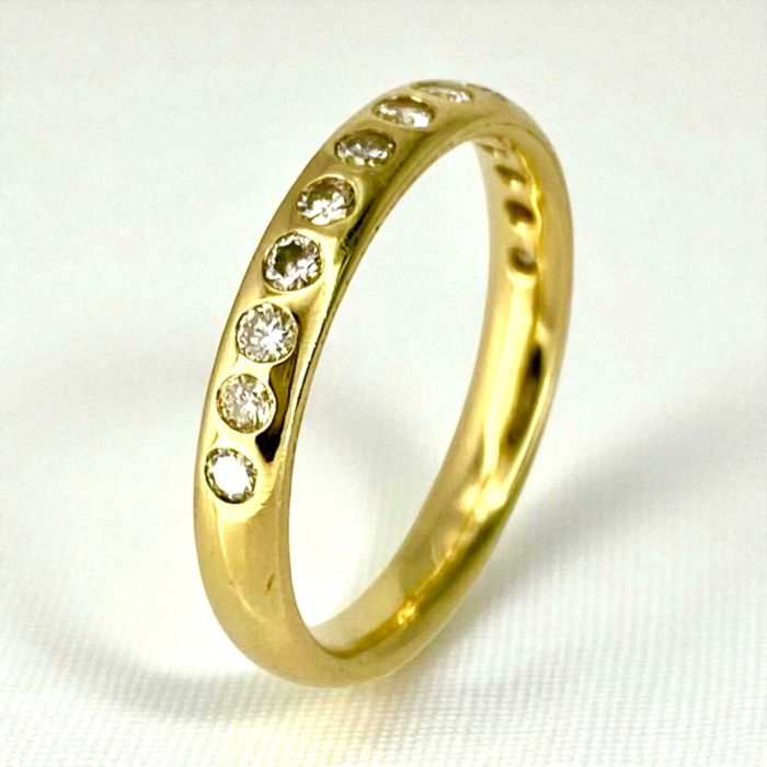 Zeitloser Damenring in 585er Gelbgold. Die hochglänzende Ringschiene fasst schauseitig 13 Brillanten von gesamt ca. 0,19 ct in eingeriebenen Fassungen.