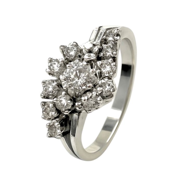 Ein Traum aus Weißgold und Brillanten. Der funkelnde Ringkopf zieht alle Blicke auf sich: Hier strahlt ein größerer Brillant im Zentrum, umgeben in geschwungenen Linien von 12 kleineren Brillanten. Die edlen Steine harmonieren perfekt mit dem auf Hochglanz polierten Weißgold 585, aus dem die Ringbasis und die Fassungen gefertigt wurden. Dieser Ring ist außergewöhnlich, ohne aufdringlich zu sein und findet so die perfekte Balance aus Luxus und Alltagstauglichkeit.