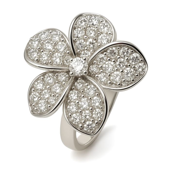 Damenring in 585er Weißgold. Der Ringkopf hat das Design einer Blüte. Er ist mit funkelnden Zirkonia bestzt.