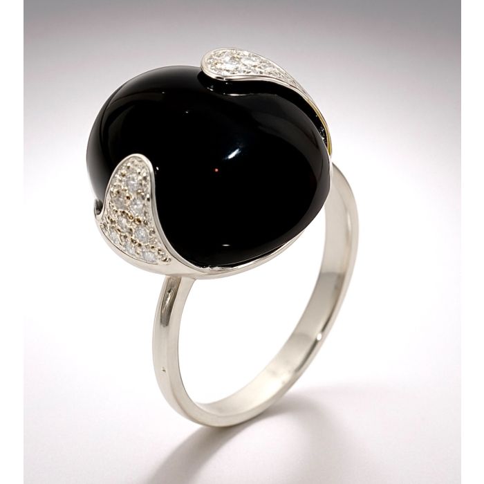 Hübscher Damenring in 585er Weißgold mit erhöhtem Ringkopf. Darin wird ein Onyxcabochon von einer Fassung,besetzt mit insgesamt 12 Diamanten, gehalten.