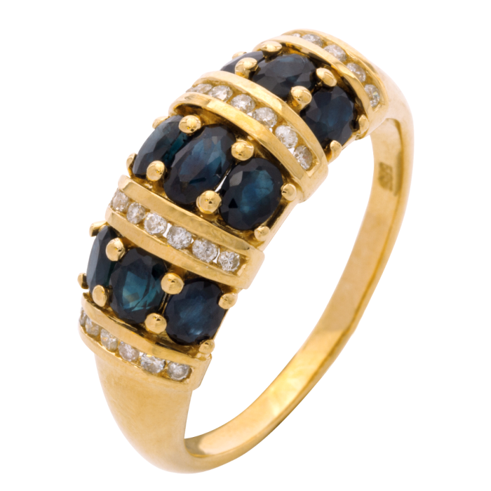In warmem Gelbgold finden sich feine tiefblaue Saphire im Ovalschliff wieder, die ein modernes Zusammenspiel mit royalem Charme ergeben.