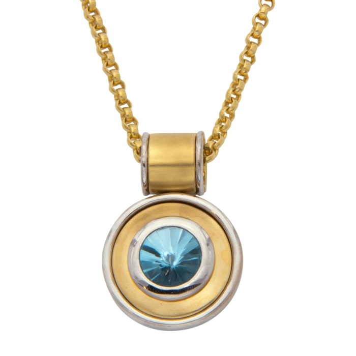 Der Clipanhänger fasst einen runden Fancy Facetteschliff Blautopas in einer weißgoldenen Zargenfassung.