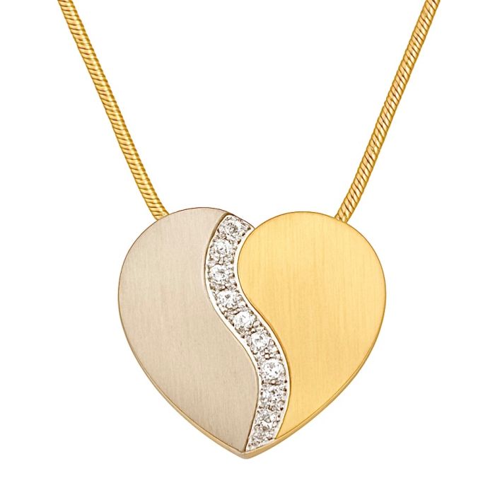 Auf der einen Seite ist das Herz in Weißgold gehalten, auf der anderen in Gelbgold. Eine hochglanzpolierte Schlangenkette optimiert den Halsschmuck.