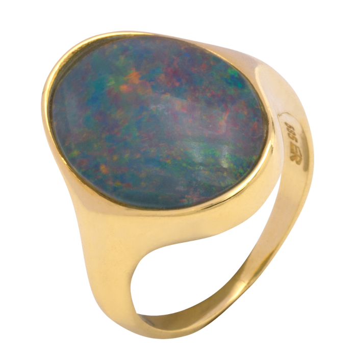 Der Damenring hat einen großen ovalen Ringkopf. Darin leuchtet eine tolle Opaltriplette.
