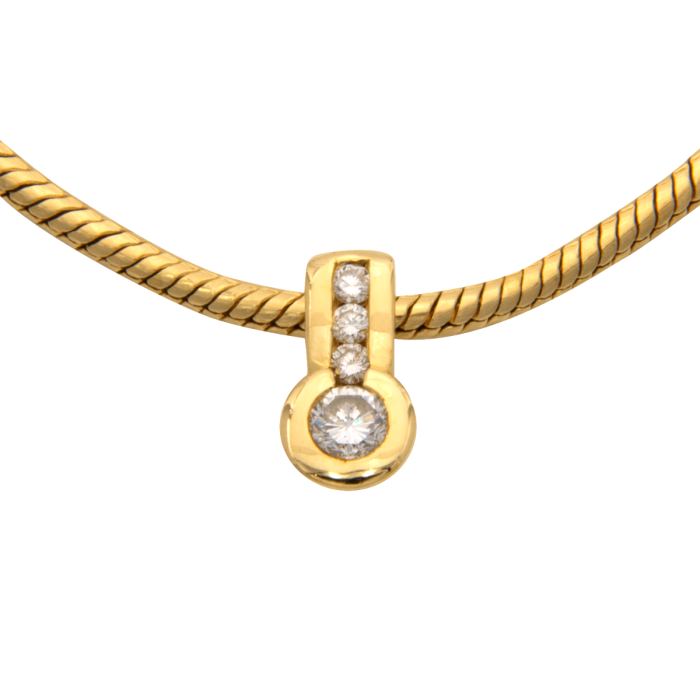 Die dazugehörige Schlangenkette, ebenfalls in hochglänzendem 750er Gelbgold komplettiert den Halsschmuck.