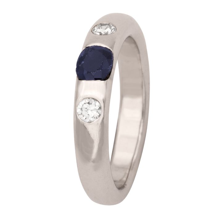 Schauseitig ist mittig ein Saphir gefasst. Rechts und links davon leuchtet jeweils ein Brillant von 0,10 ct.