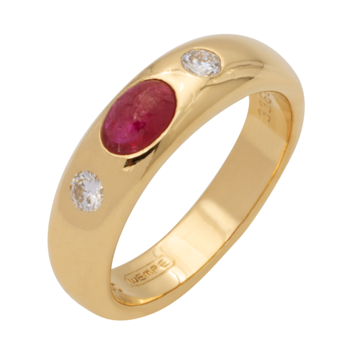 Er hat eine hochglanzpolierte Ringschiene. Mittig funkelt ein Rubin in Cabochonschliff. Flankiert wird er von 2 Brillanten.