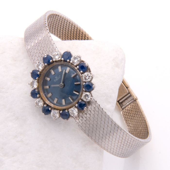 Vintage Damenuhr in 750er Weißgold mit Saphir-Brillant-Lünette von EXQUISIT