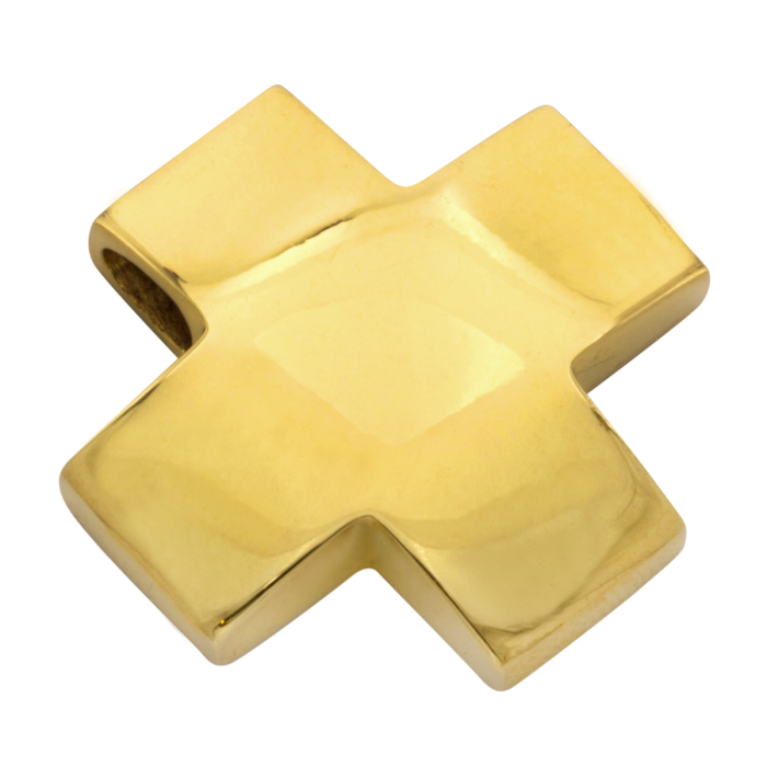 Das Schmuckstück, aus 585er Gelbgold, in moderner Kreuzform hat gleich lange Quer und Längsbalken.