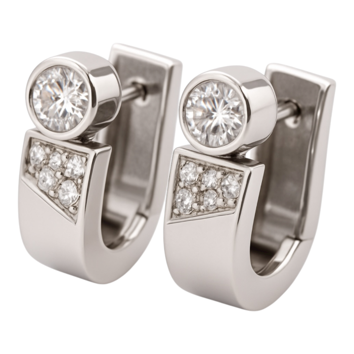 Das runde Kopfteil fasst einen funkelnden Zirkonia in Tonnenfassung auf dessen Rückseite der Stecker angebracht ist.