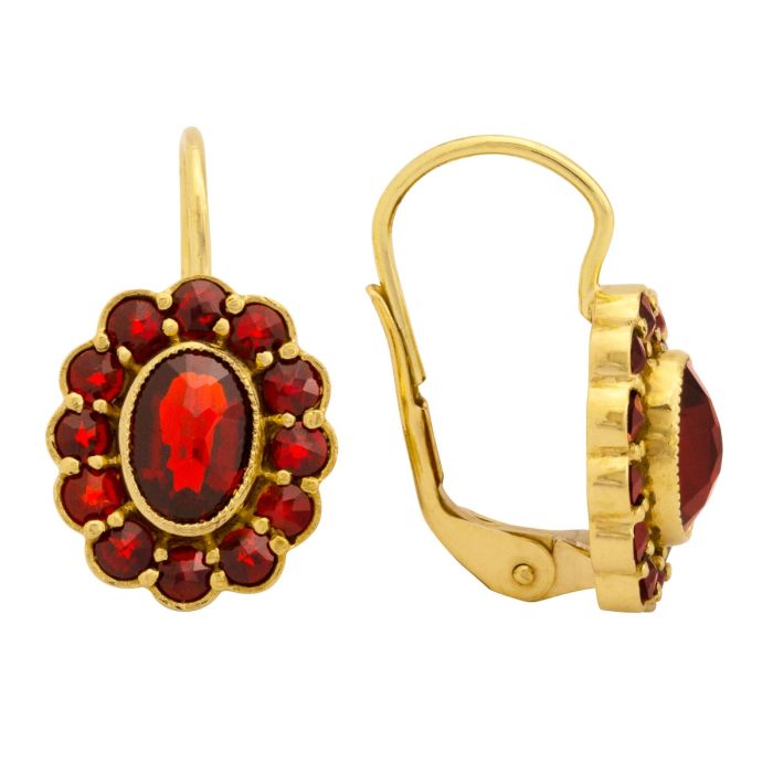 Mittig thront je ein Granat in Ovalschliff. Dieser wird entouriert von kleineren runden Granatsteinen.