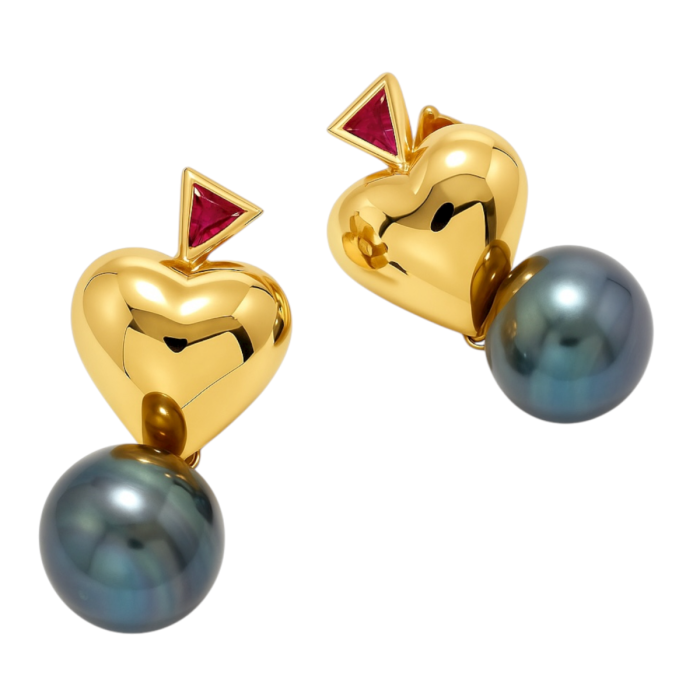 Für den besonderen zusätzlichen Effekt sorgen die Rubine, welche die Ohrstecker überhalb der Herzen in Dreiecks Fassungen zieren.