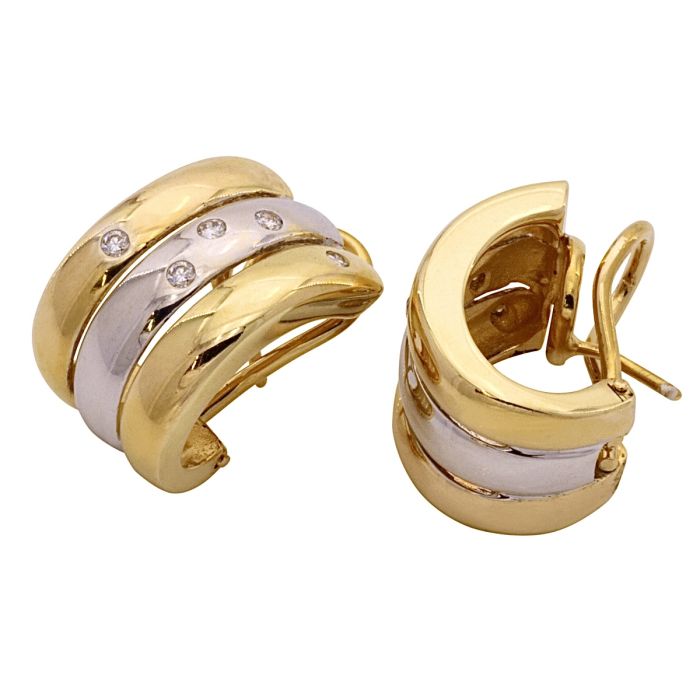 Die massiven Schmuckstücke haben 3 aneinandergereihte halbrunde Bänder. Die 2 Äußeren sind in Gelbgold gearbeitet, die mittlere in Weißgold.