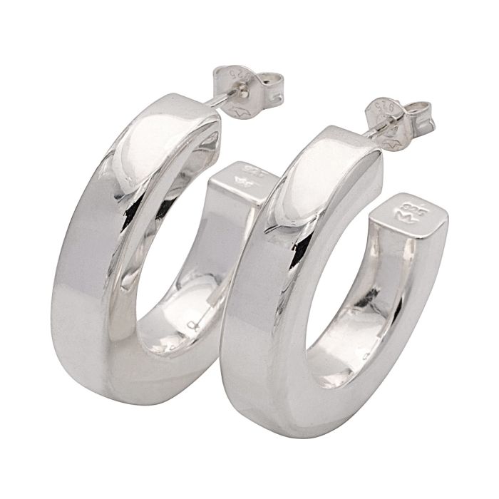 Die großen Vierkant-Creolen mit Stecker sind glänzend poliert. Sie sind allseitig 5 mm breit und haben einen Durchmesser von 2,7 cm.
