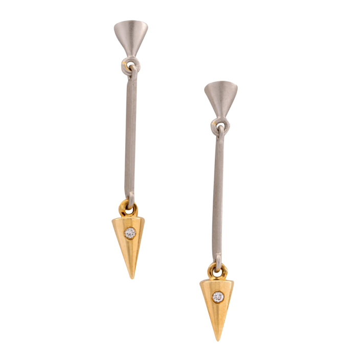 Die Stabförmigen Zwischenelemente haben Ösen, an denen jeweils ein Kegelförmiges Element angebracht ist. Das Obere ist die Verbindung zum Stecker und das untere frei hängende ist vergoldet und fasst je einen Brillanten von 0,02 ct.