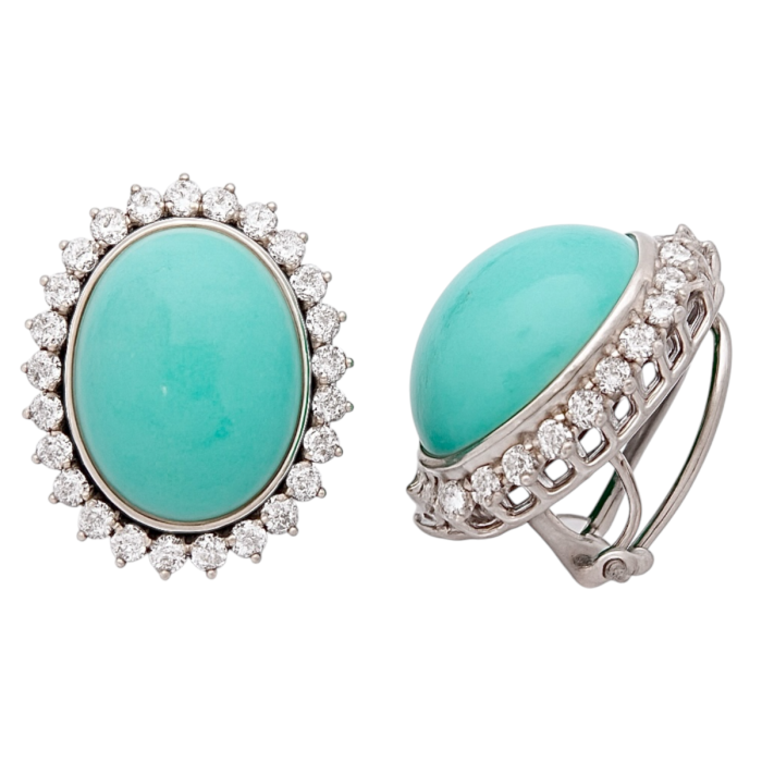 Die Ohrclips bestechen durch ihre Form und Farbe der Edelsteine. Das leuchtende Türkis ist umgeben von funkelnden Brillanten, die das Licht vielfältig brechen.