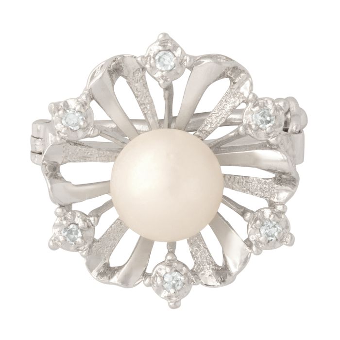 Mittig sticht die Zuchtperle mit ihrem hellen Lüster hervor. Die filigranen kleinen Streben um die Perle sind abwechselnd satiniert und hochglanzpoliert gearbeitet.