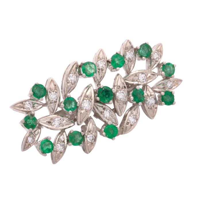 Das Schmuckstück aus 585er Weißgold ist komplett besetzt mit Smaragden und Diamanten.