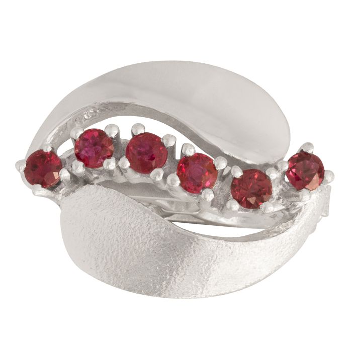 Ein Teil ist mattiert gearbeitet, der andere hochglanzpoliert.Mittig wird er von 6 Rubinen in Krappenfassung geziert, welche in einer ebenfalls geschwungenen Linie aneinandergereiht sind.