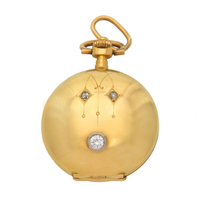 Der Sprungdeckel ist verziert mit einem ca. 0,12 ct. großen Brillanten (in modernem Schliff, wohl später ergänzt) der mit seinem Funkeln alle Blicke auf sich zieht. Fein gravierte Linien und zwei kleinere Altschliff-Brillanten komplettieren den Dekor auf der Schauseite. Das weiß emaillierte Zifferblatt hat schwarze arabische Zahlen für die Stunden und goldene Pünktchen für die Minuten sowie feine Louis-Quinze-Zeiger.