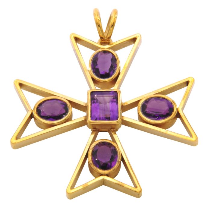 Das Kreuz fasst insgesamt 5 Amethyste. Der mittlere ist in quadratischer Form, alle weiteren haben einen Ovalschliff. Die Steine sitzen fest in massiven Zargenfassungen.