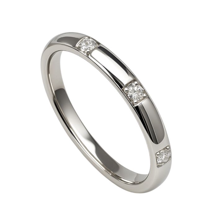 Damenring in 585er Weißgold. Der Bandring hat eine schmale hochglänzende Ringschiene welche schauseitig 3 Brillanten in gleichmäßigen Abständen fasst.