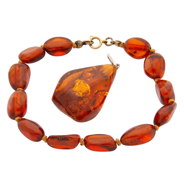 Das Set besteht aus einem Bernstein-Anhänger mit versilberter Öse und einem Armband mit vergoldetem Federringverschluss.