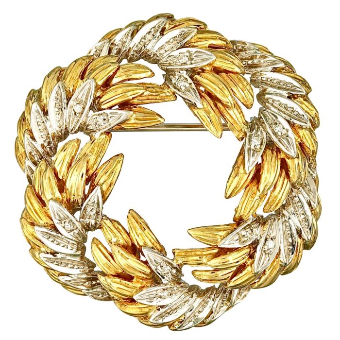Die Brosche erstrahlt durch eine elegante Kombination aus Gelb- und Weißgold.