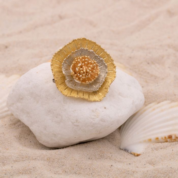 Wie eine massive Blüte wirkt das Schaustück der Brosche. Jede Stufe ist in einer anderen Goldfarbe gehalten. Der Äußere in Gelbgold, der Mittlere in Weißgold und der Innere, welche den Blütenkelch darstellt in Roségold. Daher ist die Brosche wunderbar mit anderen Schmuckstücken kombinierbar.