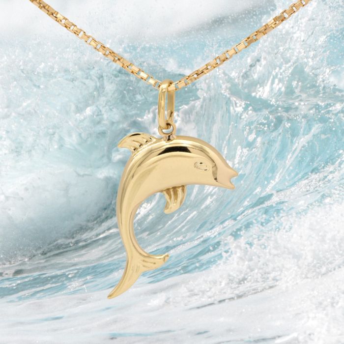 Kettenanhänger in 14 karätigem Gelbgold in Form eines Delphins.