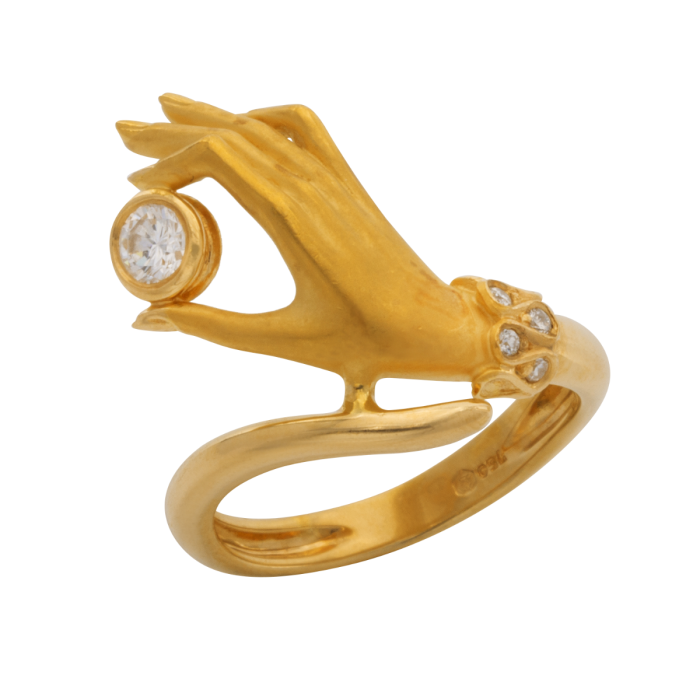 Der Ring mit der verschlungenen Firmensignatur CyC und der Nummer 84396 hat eine gerundete, glänzend polierte Ringschiene, aus der sich schauseitig eine Hand entwickelt, die mattiert ist. Den Übergang bildet ein schlaufenförmiges Armband besetzt mit 5 kleinen Brillanten von zus. ca. 0,08 ct. Daumen und Zeigefinger halten einen größeren Brillanten von ca. 0,17 ct. (W, VVsi)