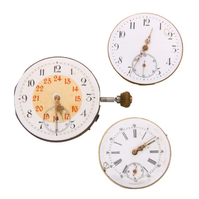 Durchmesser des größten Uhrwerkes 49,42 mm, H. 7,47 mm, Gew. 70,3 gr. Brückenwerk mit Kompensationsunruh, Breguetspirale, Ankerhemmung und Rücker-Reglage, funktionsfähig ! Zifferblatt mit innen angebrachter 24 Stunden-Anzeige. Krone vorhanden