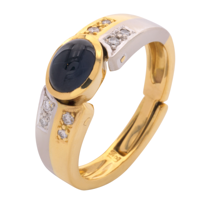 Der Ring ist mittig mit einem Saphir Cabochon in Zargenfassung besetzt.