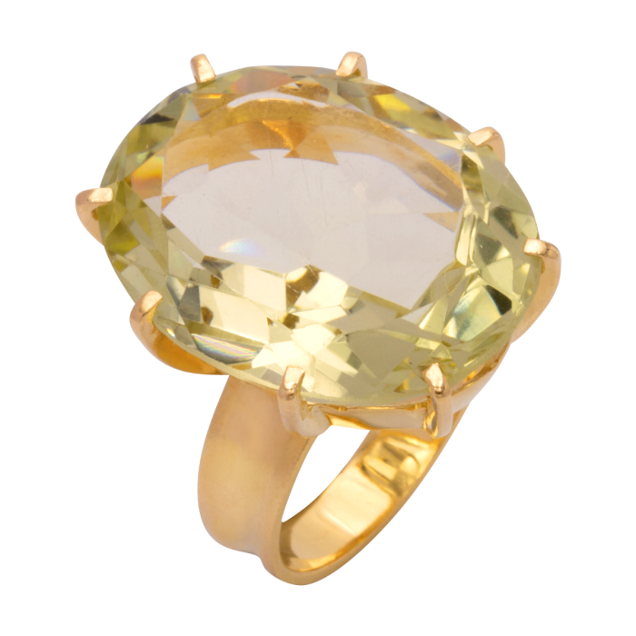 Das Herzstück des Schmuckstückes ist der große leuchtende Citrin in Ovalschliff, welcher in einer hohen Fassung mit massiven Krappen sitzt.