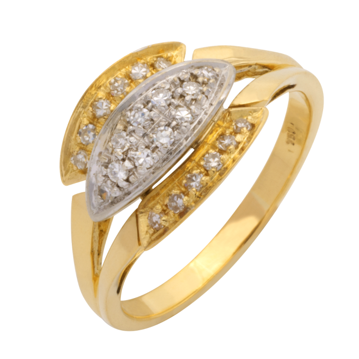 Dieser ist leicht getreppt und hat Schiffchenförmige Elemente. Die beiden Äußeren sind ebenfalls in Gelbgold, der mittlere Teil in Weißgold gehalten. Alle sind besetzt mit Diamanten. Insgesamt 22 Edelsteine zieren diesen wundervollen Handschmuck.