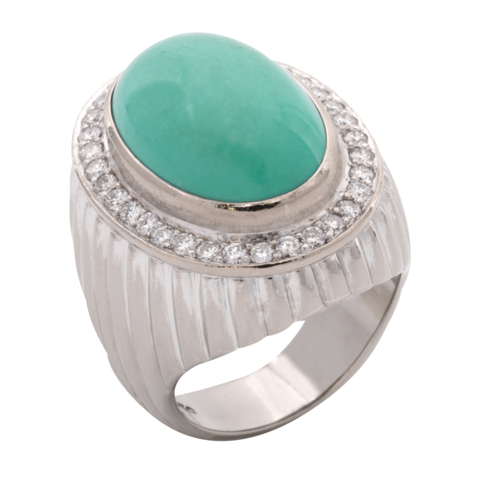 Die Schauseite präsentiert einen einmaligen Türkis-Cabochon in exzellenter Qualität von ca.18 ct. Der schöne Edelstein ist entouriert von 34 Brillanten (W, VSI) von zusammen ca. 0,70 ct.