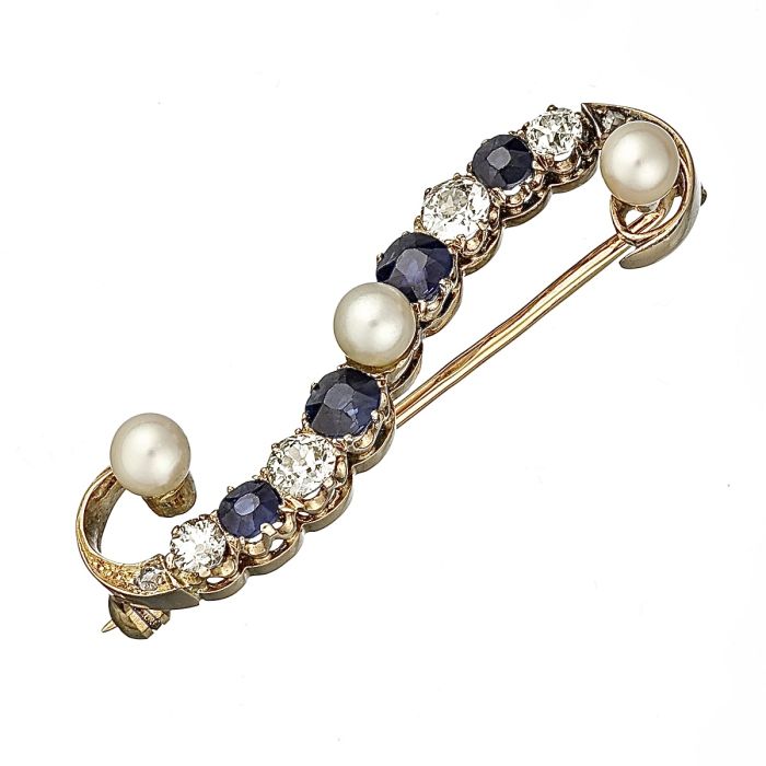Die Nadel ist besetzt mit 4 Altschliff-Diamanten von ges. 1,20 ct, 4 Saphiren und 3 Süßwasserperlen.