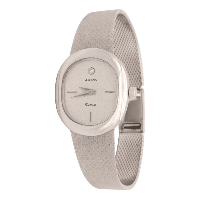 Schlichte, aber dennoch sehr elegante Damenarmbanduhr aus dem Hause ALPINA / Comtesse in 14-karätigem Weißgold.