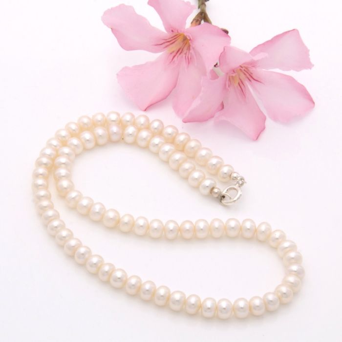 Die Damenkette, perfekt auch als Brautschmuck geeignet, hat gleichmäßige Süßwasserperlen mit hellem Lüster aneinandergereiht. E