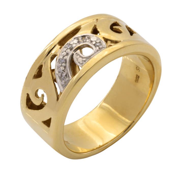 Schauseitig wird der Ring von durchbrochen gearbeiteten Elementen in geschwungener Form geziert. 5 Diamanten funkeln auf einem rhodinierten Hintergrund.
