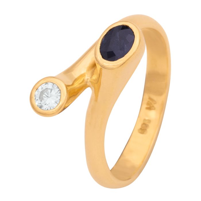 Schauseitig gegeneinander verlaufend und auf den Enden besetzt mit einem eingefassten Saphir in Ovalschliff und einem Brillanten von ca. 0,20 ct. mit sehr schönem Feuer, macht der Ring eine moderne und zeitlose Figur.