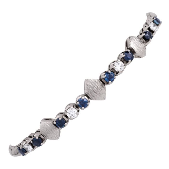 Mittig sind entlang des Armbandes in Krappenfassungen und abwechselnd Saphire und Brillanten gesetzt.