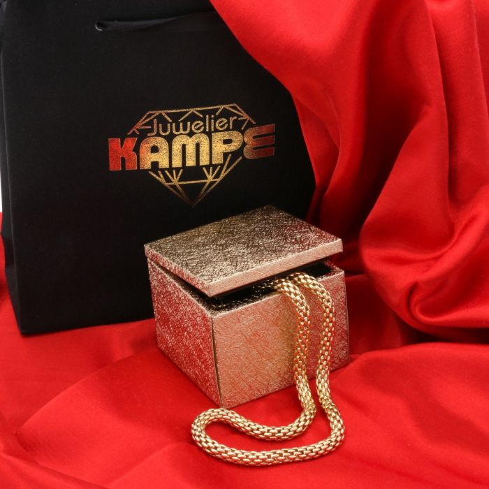 Das Schmuckstück mit seiner hochglanzpolierten Strickmustergliederung ist massiv gearbeitet und passt sich perfekt dem Dekolleté an.