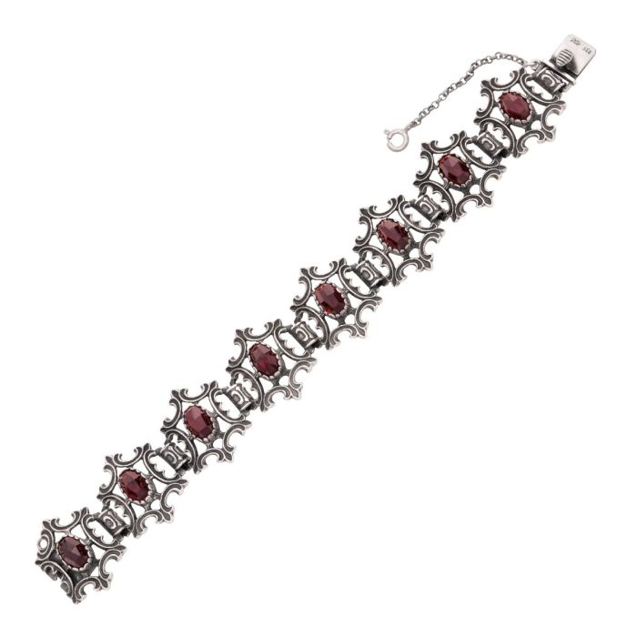 Die offenen Glieder aus Volutenmotiven sind im Zentrum besetzt mit ovalen Granatsteinen im facettierten Rosenschliff.