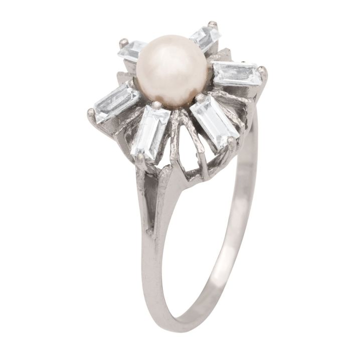 Mittig ragt eine schöne Süßwasserperle mit hellem Lüster hervor. Entouriert wird die Perle von Zirkonia in Baguetteschliff.
