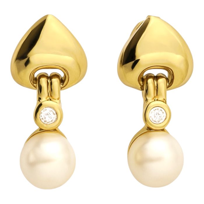 Der schwingende untere Teil ist mit jeweils einem Brillanten in Zargenfassung besetzt und einer schönen gleichmäßig runden Süßwasserzuchtperle.